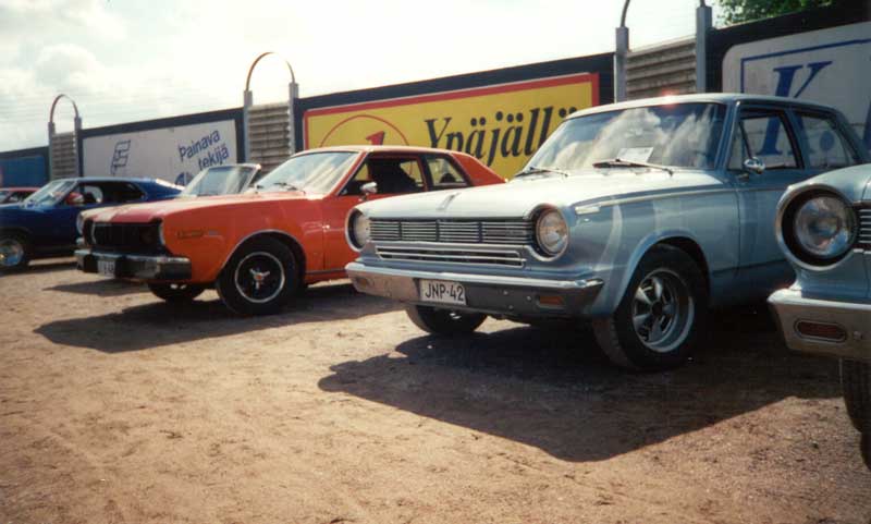 Here's a picture of Teemu Ketola's '65 American 330, it's got a mopar v8 in it, quite a cool car, too bad for the boat anchor ;) In the picture is also Petri Henttula's '70 Hornet SST 304 (which has a '76 front clip as you can see...)