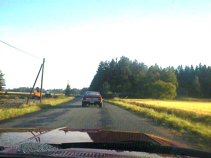 When we arrived at the 'camping place' the suprise was quite pleasant. Juha Pihkanen hadn't promoted the place very much and basically he had just stated that it was "possible to sleep there in the middle of the mildew and decay, bring along a tent." Not very pleasing to the common car hobbyist. The house itself was very much intact (shown in the photo below) and Juha had cut the grass on the yard so it would have been quite easy to set up a row of tents outside even if it was raining. Happily the rain almost stopped as the night approached, and we bathed in a very cozy original Finnish sauna, had a few beers, and along the night it became clear that we'd all be able to sleep indoors at comfortable and soft beds laid down on the floor. During the evening a few AMCCF members called and checked on us and how we were doing, and one unfortunate member broke his '71 Matador 232 right before he could get to Forssa, we tried giving technical advice, but we lacked the part he needed for his car, happily someone else helped him out on the road and he made back home safely.