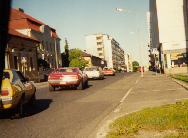On Saturday, after waking up and eating on the high quality restaurant that was at the camp site (the food was delicious!) the cruising started. a few cars were missing from the cruising due to some minor problems with getting to Pori in time, but most showed up. We gathered in a local burgerjoint called Hesburger, mainly becouse it has a big and roomy parking lot and also it's the usual meeting place for cruises at my hometown. Let me tell you, it was awesome to cruise in my hometown with almost a dozen AMCs following... Nothing quite like it.