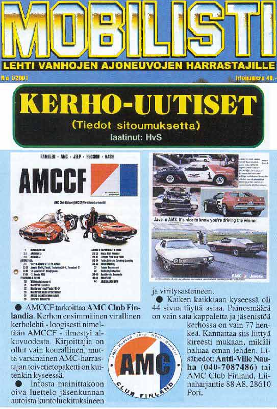 | 16.02.2001 | News, Contacting Info | AMCCF Club Magazine get's very admirable comments from the leading old-car magazine in Finland, (Mobilisti), Click Here to read all about it! |