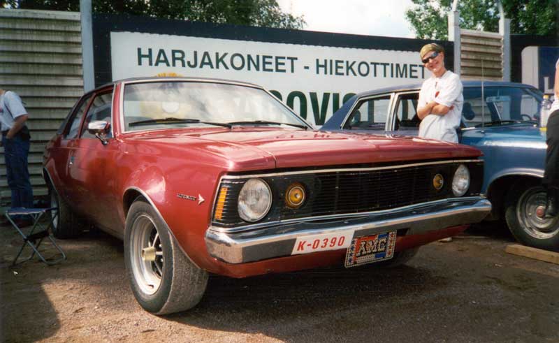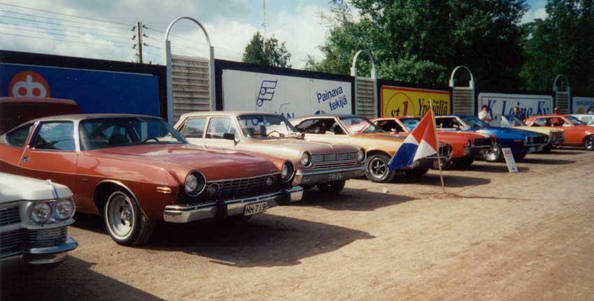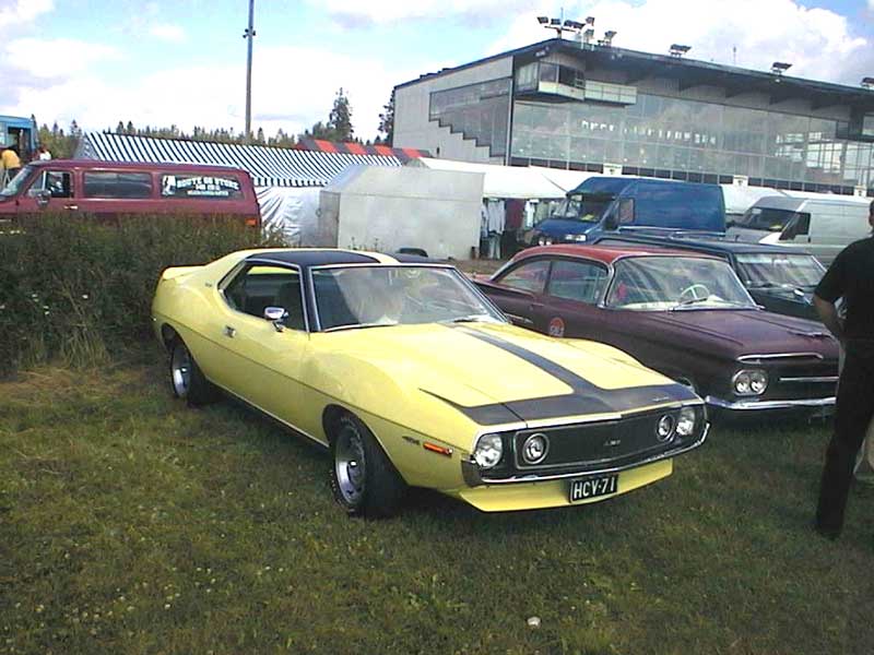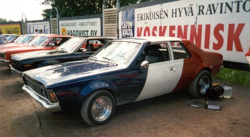 Here's a picture of Teemu Ketola's '65 American 330, it's got a mopar v8 in it, quite a cool car, too bad for the boat anchor ;) In the picture is also Petri Henttula's '70 Hornet SST 304 (which has a '76 front clip as you can see...)