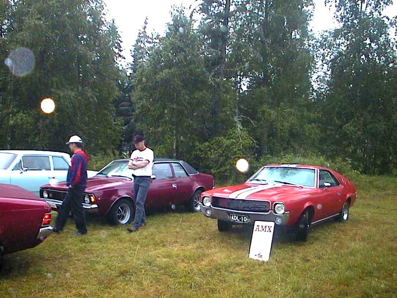 Ok, last year the weather was great (with just one slight shower in the whole weekend) but this time, the day before was seriously blank and depressing. It rained all day and it wasn't looking good the event the following day. The image above just about covers the whole feeling, it's takend from Tapanainen's '70 Hornet 401cid on the way to Somero, and if you look close you can see that he's following Juha Pihkanen whom drove his '65 American 220 2D 196cid to the meet. My car was there of course, and the first time in my life I saw a fully operational 2seater AMX when Sami Toppari drove his '68 AMX 390cid to Somero. Actually he was there a few hours before us just to show off his fast car ;) (just kidding) and let me tell you his car was simply beautiful, and he had taken along an 'AMX PARKING ONLY' sign that can be seen in the pics which came very handy later on at Forssa Pilvenmäki track.