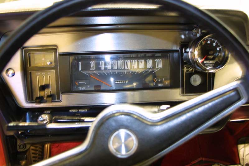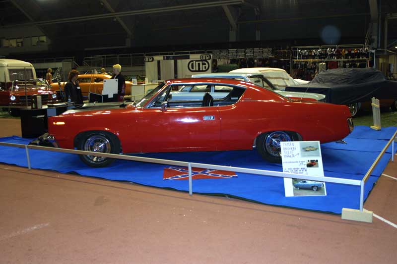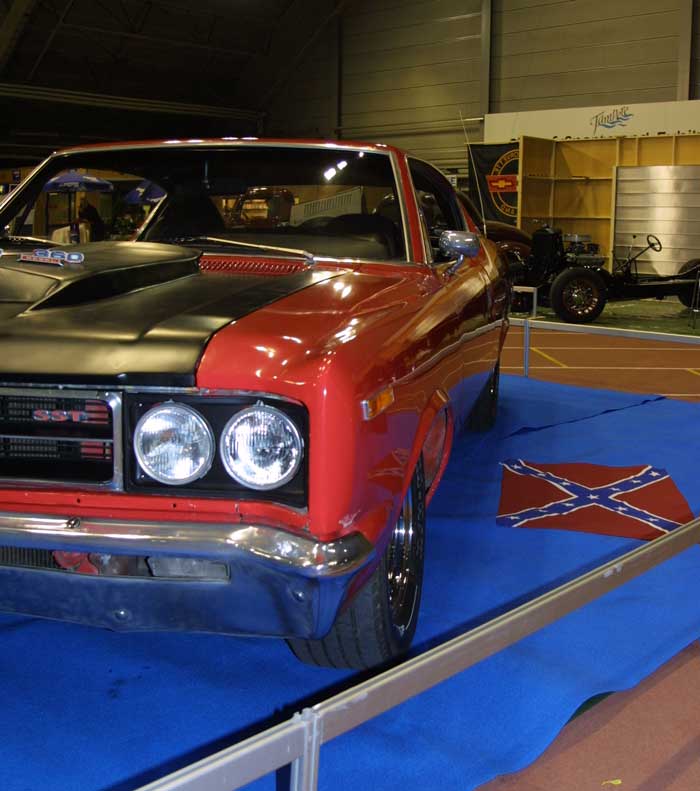 Here it is closer. Our entry to the show this year was 2 AMCs. Juha Pihkanen's light blue '65 American 220 2D with a 196cid & 3 on tree and Juha Makkonen's bright red '70 Rebel SST 2D HT with a 360cid V8 and an automatic on console. Pihkanen's car was in excellent condition, being already registered as a 'classic car' (museoajoneuvo) but Makkonen still had some issues with his Rebel 2 days before the show. He was also meaning to get it painted for the show, but unfortunately he ran out of time. Nonetheless his car looked mean and quite cool even with the old paintjob (and the Machine look hoodscoop...).